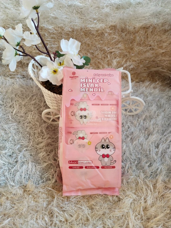 mini Islak mendil 8 paket pembe pastel renkte mini cep ıslak mendil, sevimli çizgi film desenleriyle yumuşak ve kullanışlıdır.