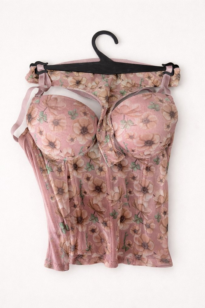 Pastel pembe renkte, kısa ve mini uzunlukta, çiçek desenli bohem tarzda Parisian esintili bustiyer. Şekillendirici kaplara sahip.