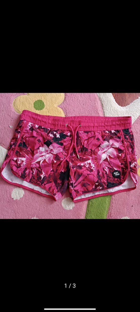 Sentetik kumaştan yapılmış, renkli batik desenli ve dantelli, fit kesim pembe mini şort. Sokak stili ve plaj için uygun.