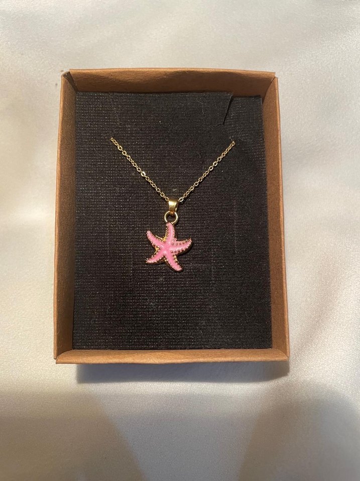 Kadınlar için tasarlanmış, pastel pembe deniz yıldızı şeklinde mini bir kolye. Kısa zincir detayı ve baskılı deseniyle bohem ve minimal tarzda, günlük kullanıma uygun.
