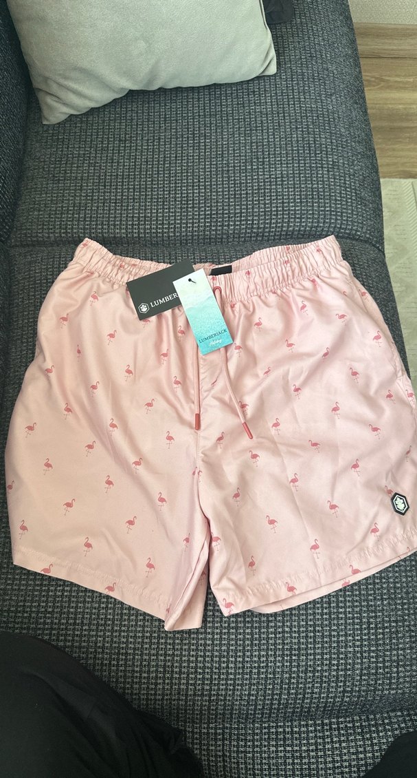 Düğmeli önde ve flamingo desenli, bol kesim pembe mini erkek deniz şortu, plaj için uygun.