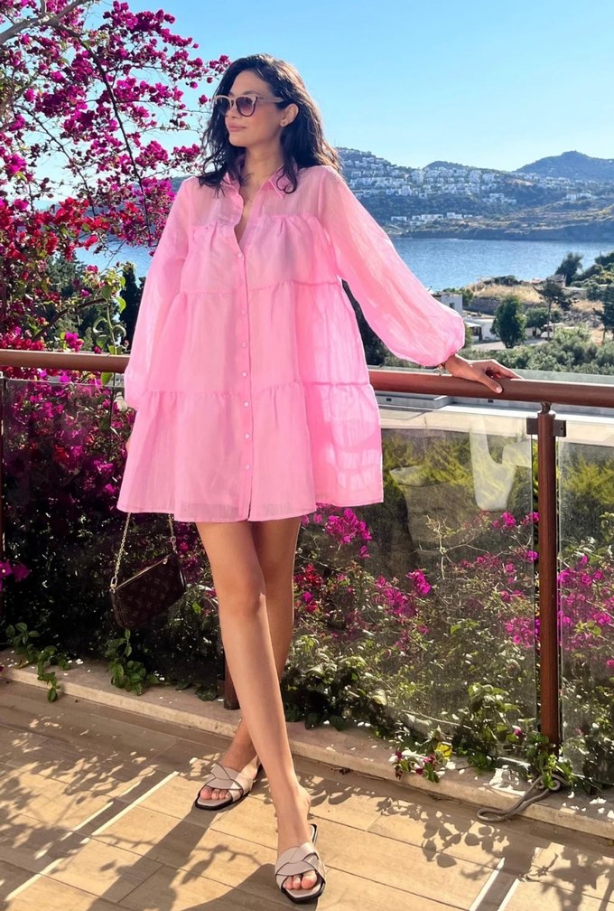 Pembe gömlek elbise, uzun kollu, V yaka ve düğmeli ön detayına sahiptir. Gevşek kesim ve mini boyuyla bohem tarzını pastel tonlarda yansıtır. Günlük kullanım için uygundur. pamuk şeker rengindedir. etiketi üzerinde, hiç giyilmedi. s-m bedene olur.