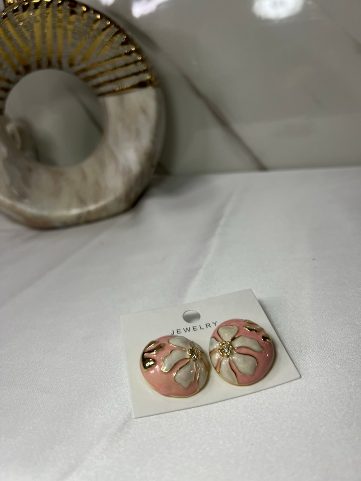 Pembe pastel tonlarda, düğmeli ve baskılı çiçek desenli, kısa mini boyda, çağdaş Paris tarzı kadın küpeler.