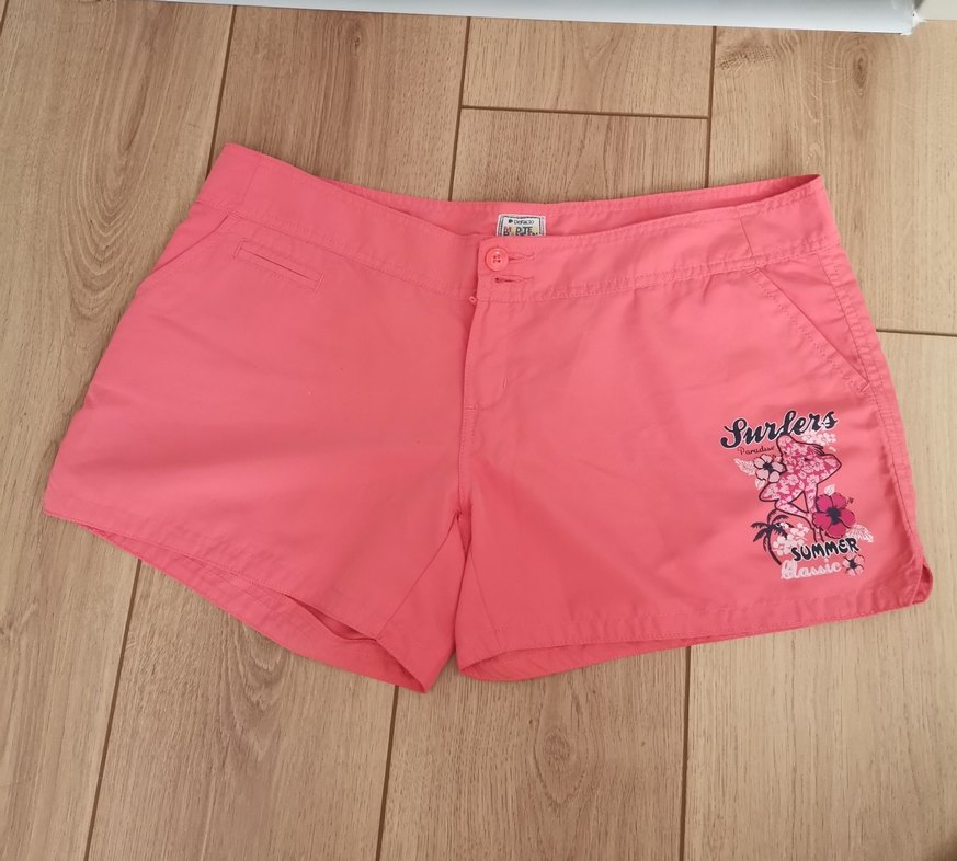 Pembe renkte, düğmeli ve bol kesim mini kadın şort. Havuz ve denizde giyilebilir.