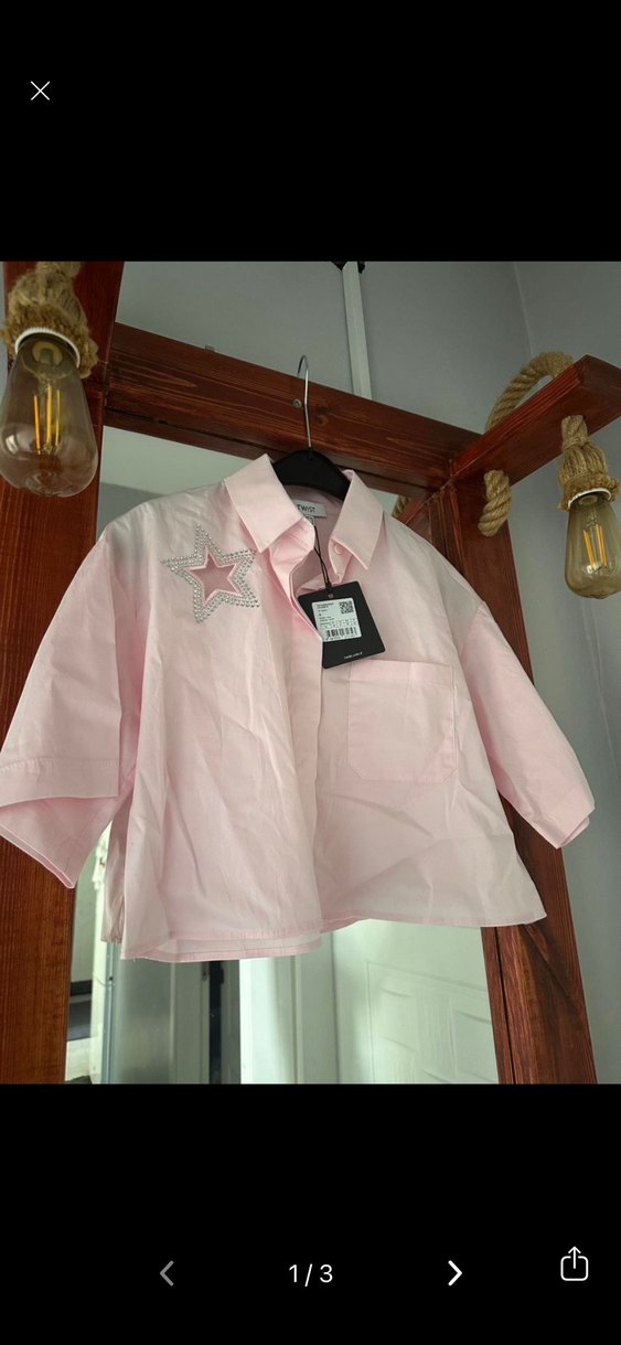 Pamuk kumaştan, düğmeli ve kısa kollu, loose fit pembe mini gömlek. Notched lapel yakalı ve baskılı yıldız detaylı, günlük sokak stili için uygun.