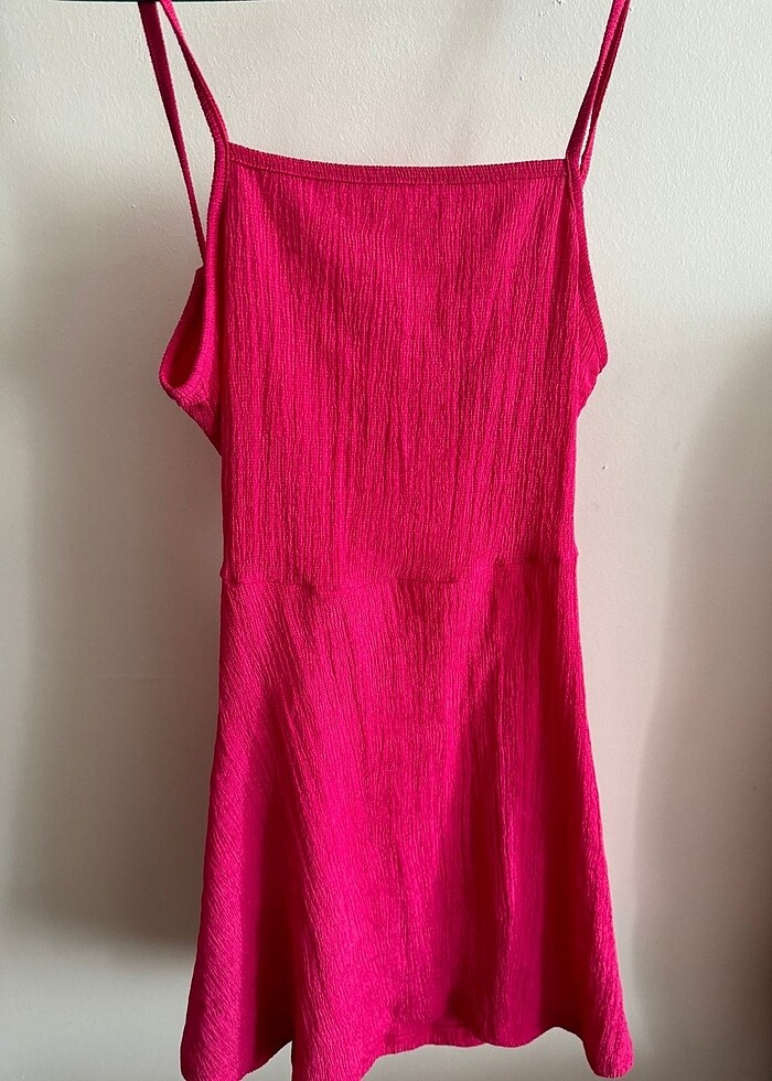Elbise 1 kere giyildi tonu 2 ton daha açık bu kadar koyu değil tatlı bir pembesi var hiç bir defosu vs yoktur. L beden ama M giyenede olur. Gönül rahatlığıyla alabilirsiniz