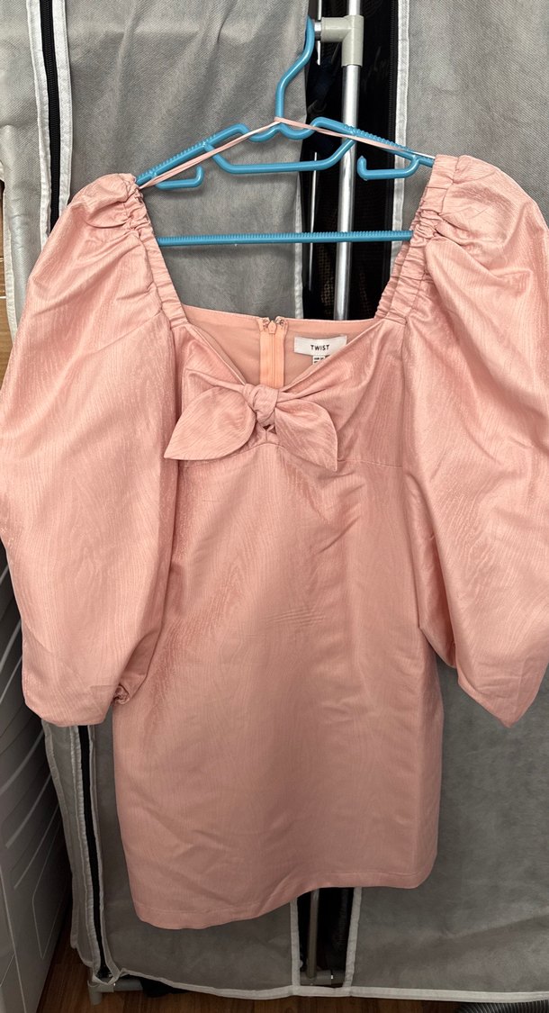 Pembe renkte, karpuz kollu Yumuşak sentetik kumaştan, fiyonk detaylı ve mini boyda, elbise .