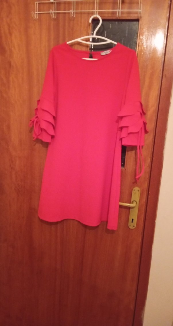 Pembe renkte, katlı kol detaylı, yuvarlak yaka ve bol kesime sahip, günlük kullanıma uygun sentetik kumaştan mini elbise.