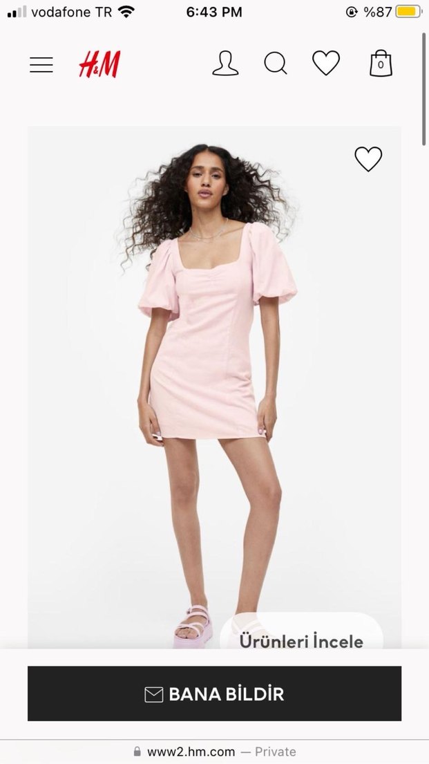 Pastel pembe mini elbise, kısa balon kollu ve kare yaka detaylıdır.
