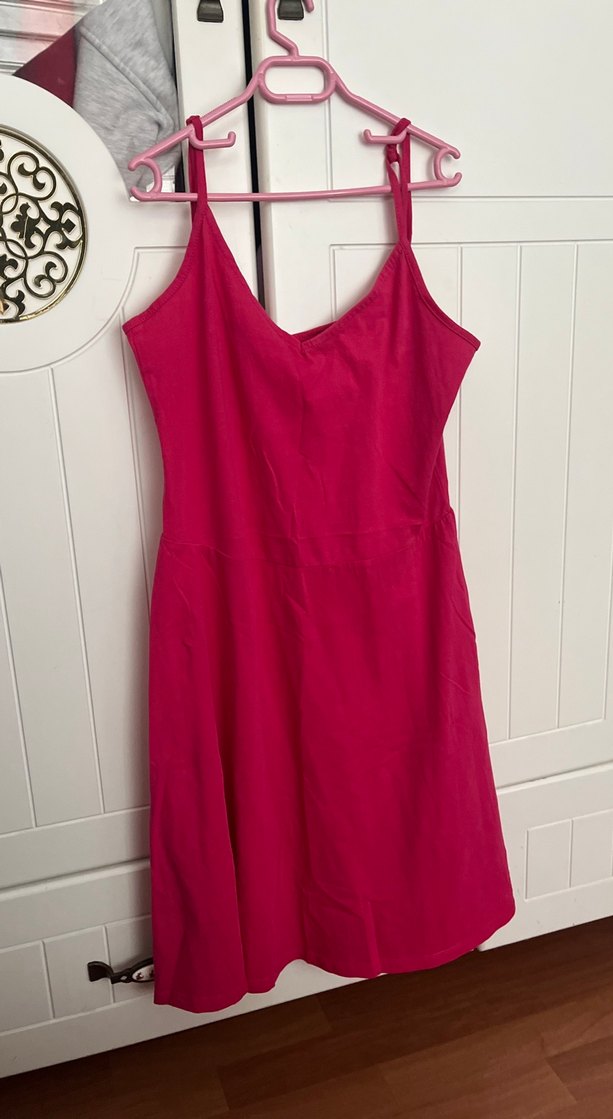 Askılı, saten kumaştan yapılmış pembe midi elbise, V yaka ve drapeli detaylarla sade ve şık bir görünüm sunar.