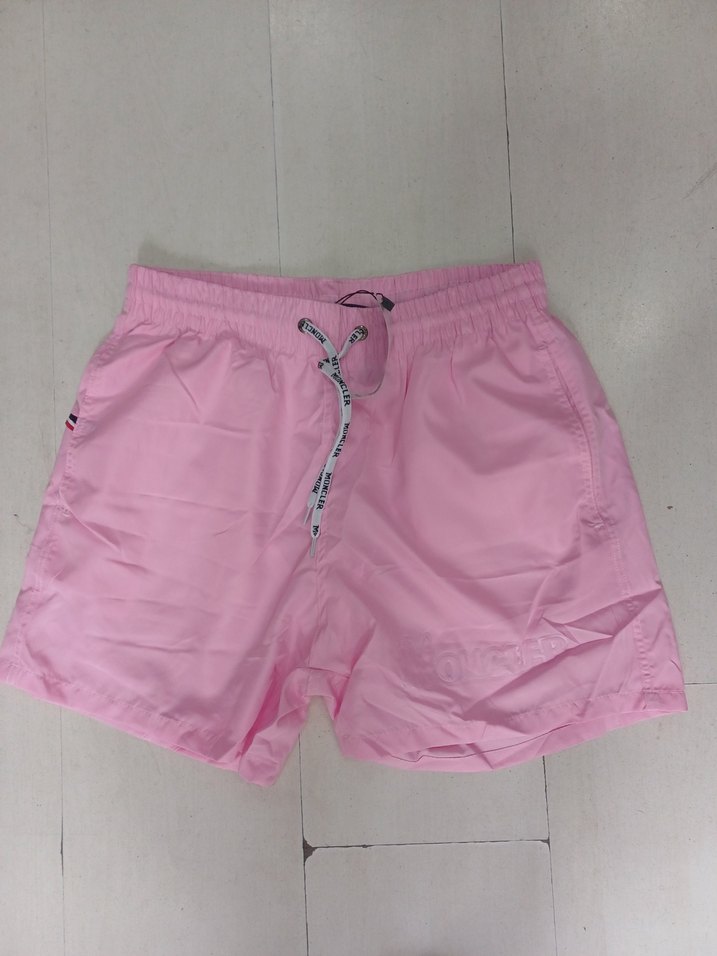 Pembe pastel renkte, bağcıklı bel ve bol kesim erkek deniz şortu. Sentetik kumaştan, plajda rahat kullanım sağlar.