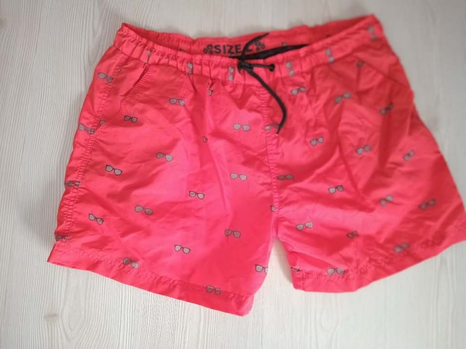 Bol kesim, pembe mini erkek deniz şortu, baskılı güneş gözlüğü desenli, düğmeli ve lastikli bel detaylıdır.