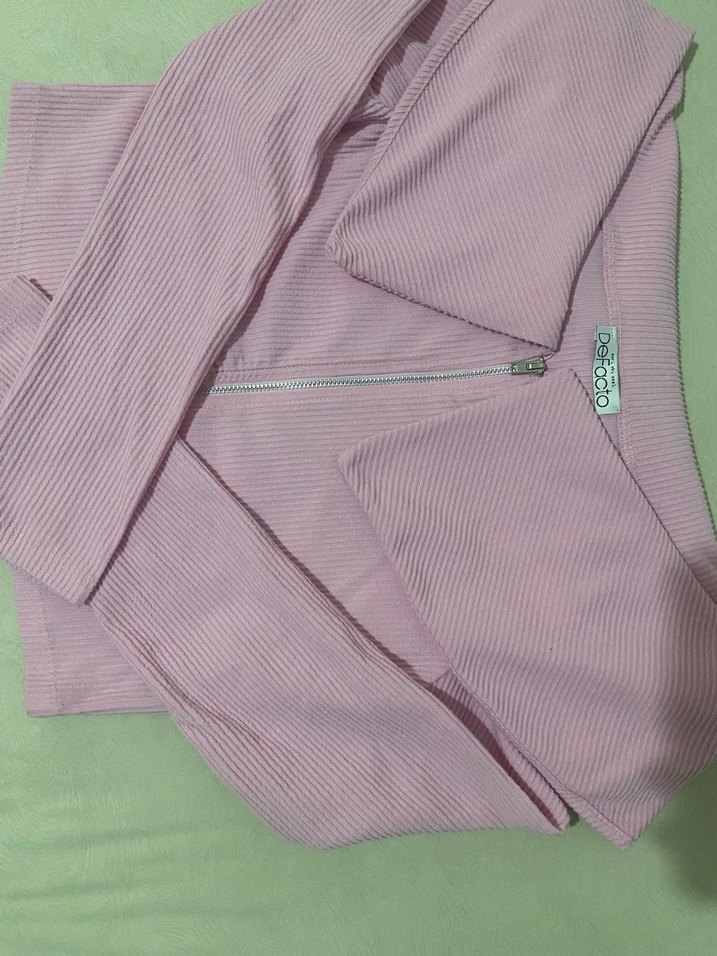 Pembe renkli, uzun kollu ve V yakalı kadın ceketi, ön fermuar detayına sahiptir. Yumuşak sentetik kumaştan üretilmiş, günlük kullanıma uygun rahat bir sokak stili sunar.