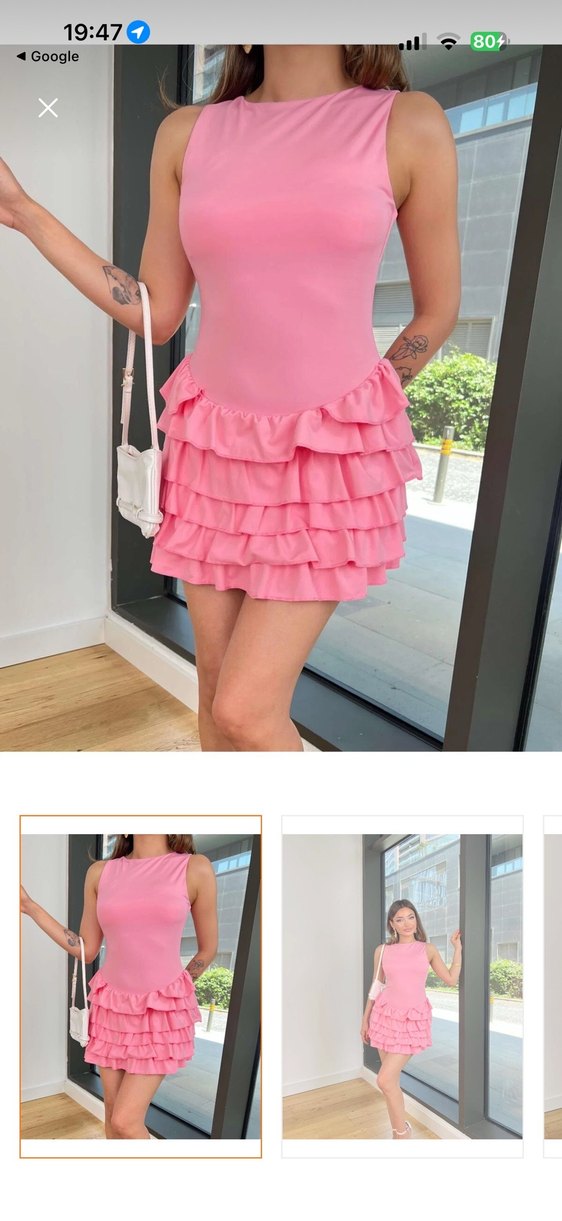 Pastel pembe, yaka ve kat kat fırfırlı, sentetik kumaştan mini ve vücuda oturan elbise. Parti ve sokak tarzı için uygun. 1 kere giyildi sadece