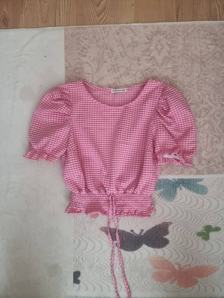 Pembe mini bluz, kısa kabarık kollara, tekne yakaya ve bel ile manşetlerde fırfırlara sahiptir. Bağcıklı, vücuda oturan kesimlidir. Sentetik kumaştan yapılmış, pastel kareli desenlidir. Günlük rahat kullanıma uygundur. M beden