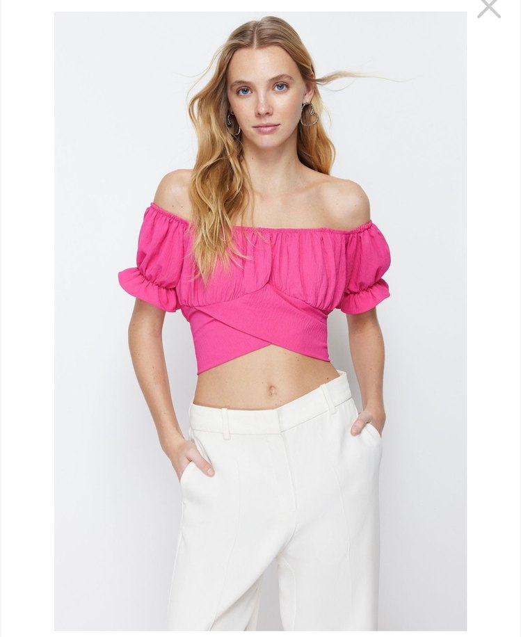 Pembe renkli, straplez yaka ve fırfırlı detaylara sahip, mini boy ve sıkı kesim bluz. Canlı tie-dye desenli, cesur Paris tarzı için uygun.