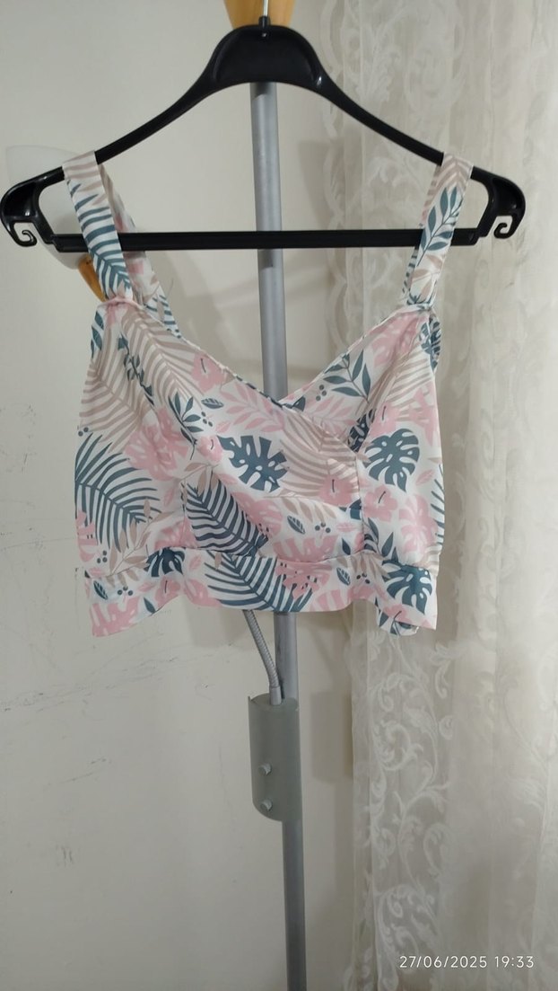 Pembe ve yaprak desenli pastel batik desenli, kısa mini boy ve fit kesime sahip emzirme sütyeni. Ayarlanabilir askılar içerir.