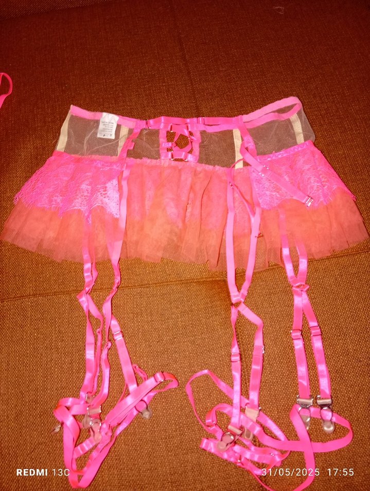 Açık pembe mini jartiyer, dantel detaylı ve ayarlanabilir askılı, şeffaf tül tasarımlı. Avant-garde gotik tarzda.