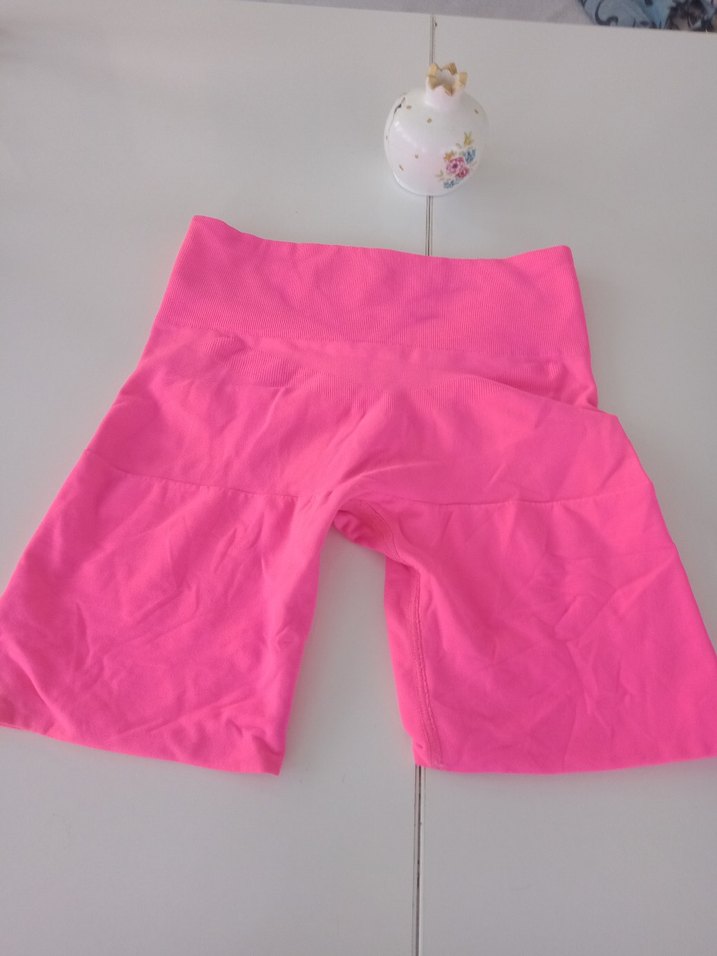 Pembe mini hamile şortu, kısa boy ve düz sentetik kumaşla sportif ve renkli bir sokak tarzı sunar.