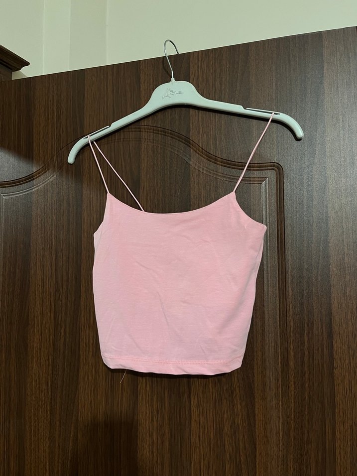 Pembe renkte mini ince askılı, düz yaka ve vücuda oturan kesime sahip. Minimalist stil, günlük rahat sokak modası için uygun.