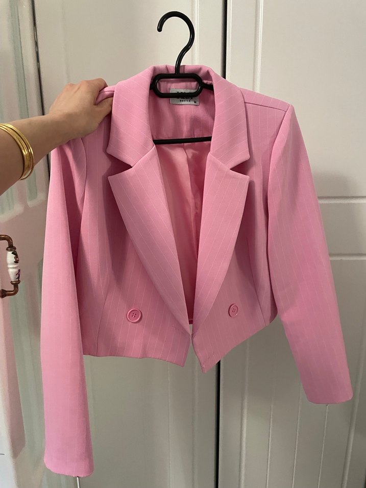 Pembe renkte, düğmeli ve yakalı mini kadın blazer ceket. Strappy kollu, regular fit ve kısa boyda, ofis ve günlük kullanıma uygun.