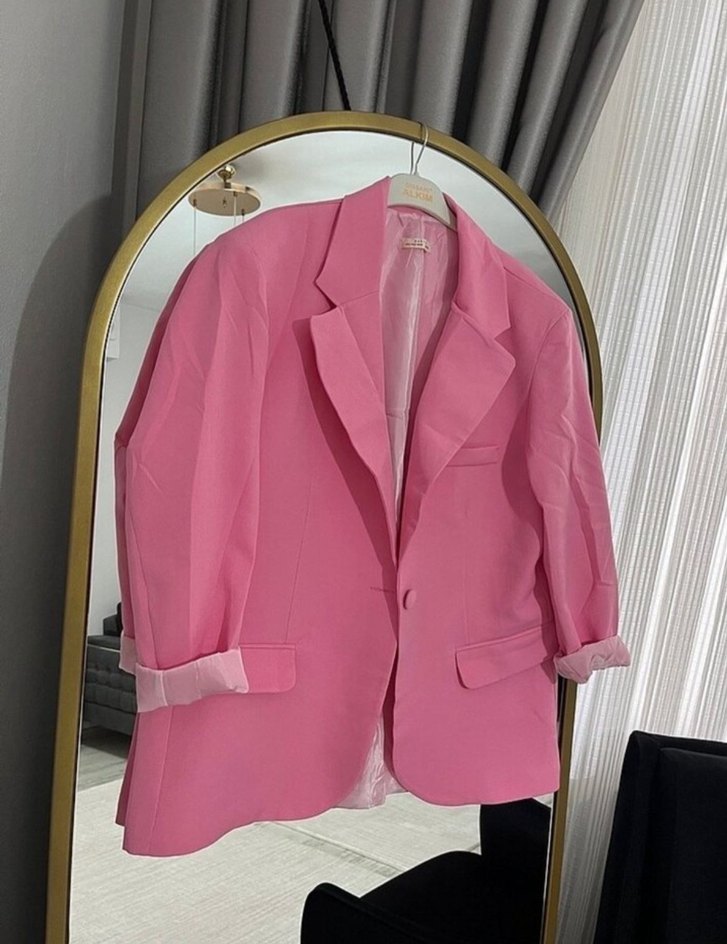 Pembe renkli kadın blazer ceket, düğmeli ön ve notched yaka detayına sahiptir. Sentetik kumaştan üretilmiş, regular fit ve uzun kolludur. Kısa boyu ve pastel tonu ile Paris sokak stiline uygundur.