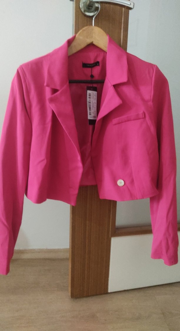 Pembe, parlak görünümlü, mini uzunlukta ve düğmeli ön kısmı ile kadın blazer ceket. Uzun kollu, regular fit ve desen içermeyen tasarımıyla ofis için uygun.