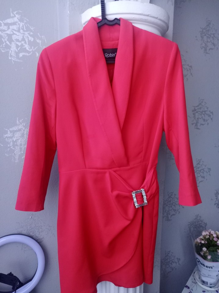 Kırmızo renkte, uzun kollu, mini uzunlukta ve regular kesime sahip kadın ceketi. Modern klasik tarzda, renkli ve desensiz, toka detaylıdır. 38 bedendir.