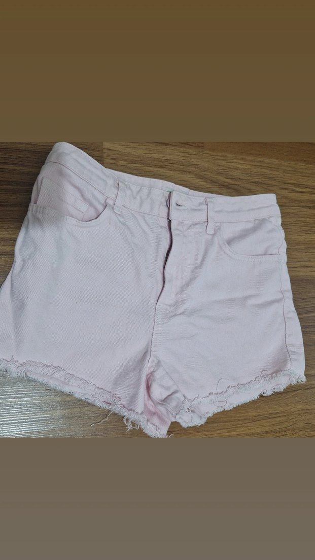 bol kesim ve yıpranmış kenar detaylı pembe mini kadın denim şort.