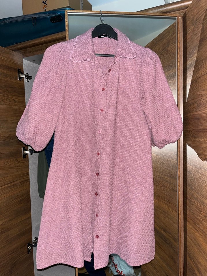 Pembe, kısa kollu, düğmeli ve rahat kesimli mini uzunlukta kadın elbise. Yumuşak dokusu ve sade tasarımıyla konfor sağlar.