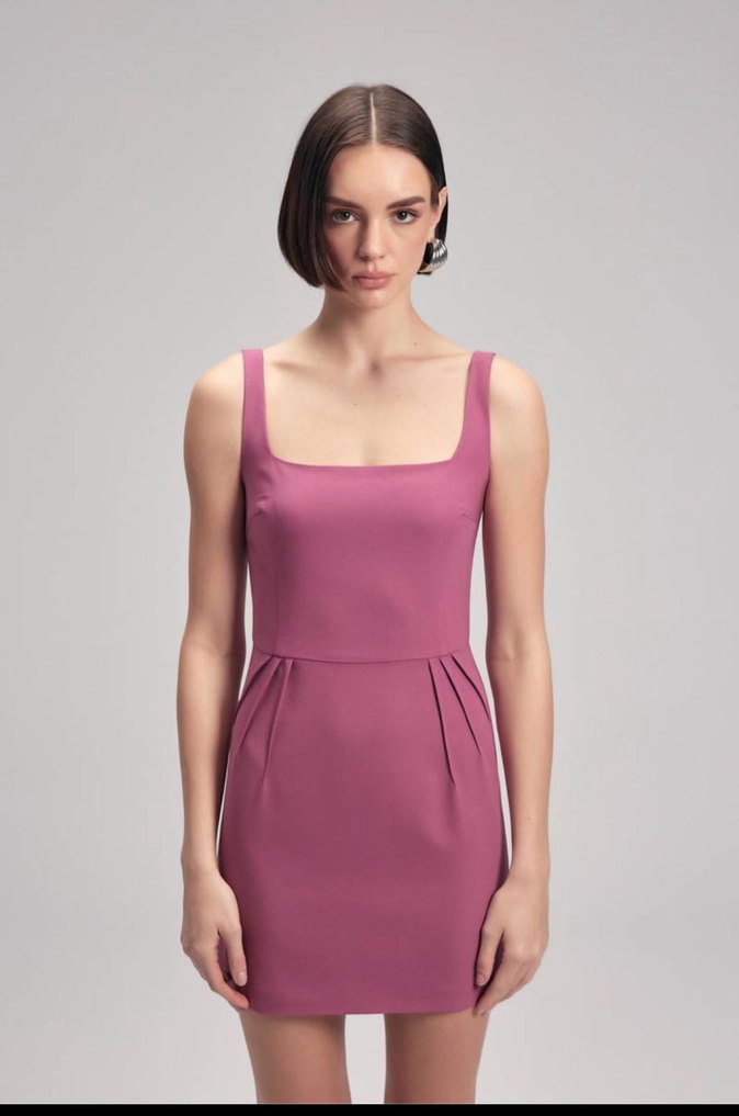 Bu pembe mini elbise, kare yaka ve kolsuz tasarımıyla ince kesimdir. İpeksi dokusu ve pastel rengiyle romantik akşamlar için ideal, minimalist ve çağdaş bir görünüme sahiptir.