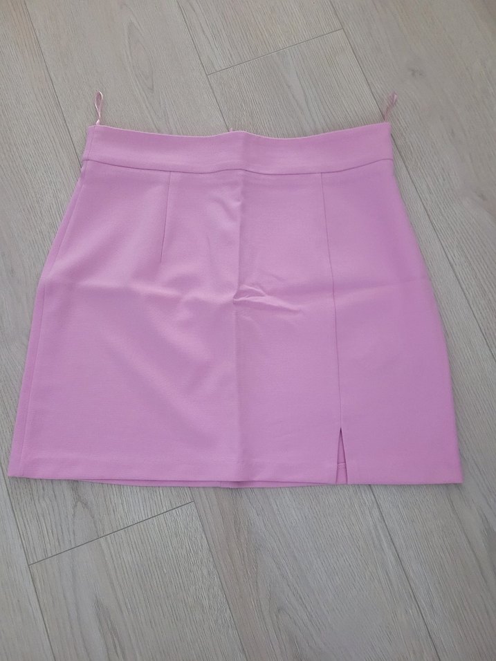 Düz pembe mini etek, sentetik kumaşla yapılmış, minimal ve desensiz. Ön küçük yırtmaçla günlük kullanıma uygun sade şıklık sunar.Daraltılmıştır.S bedene uyumludur.Bel en 39 cm,Uzunluk 44 cm.