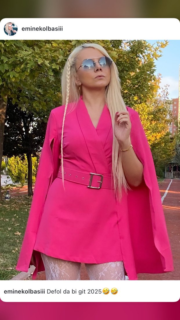 Pembe mini uzunluğunda, uzun kollu, kemerli ve avant-garde tarzda pelerin detaylı kadın elbisesi. Desensiz ve düzenli kesimlidir. Onden elbise arkadan sort gorunumundedir.