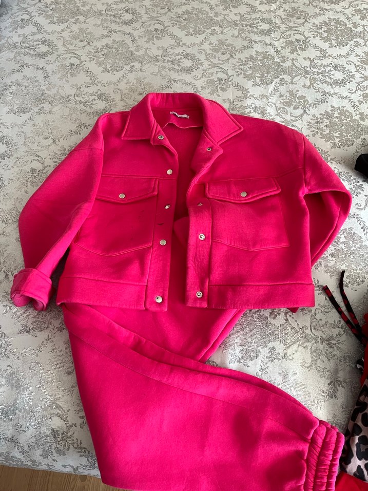 Rahat kesim, canlı pembe renkli kısa uzunlukta kadın takımı. Düğmeli, uzun kollu, yaka detaylı, yumuşak ve sıcak kumaştan günlük sokak stili için uygun.
