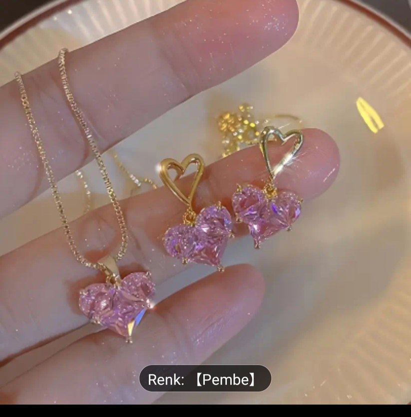 Pembe mini kalp taşlı kısa kolye seti, işlemeli detaylarla göz alıcı. Romantik geceler için uygundur. kargo aliciya aittir.