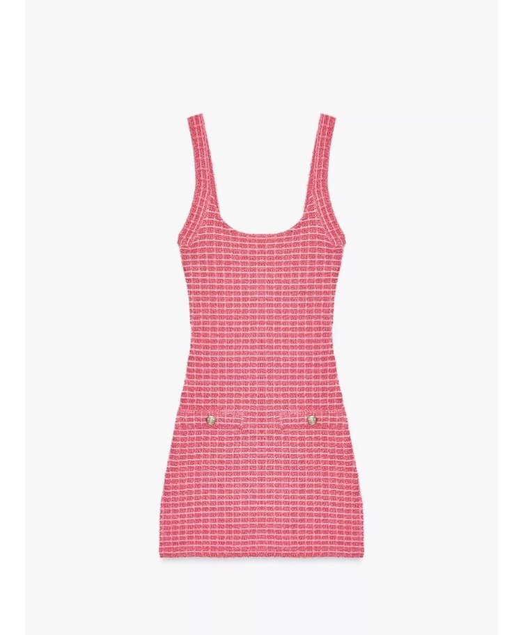 Pembe kareli triko dokulu, kolsuz ve v yakalı mini elbise, Paris sokak modasını pastel tonlarla buluşturuyor.