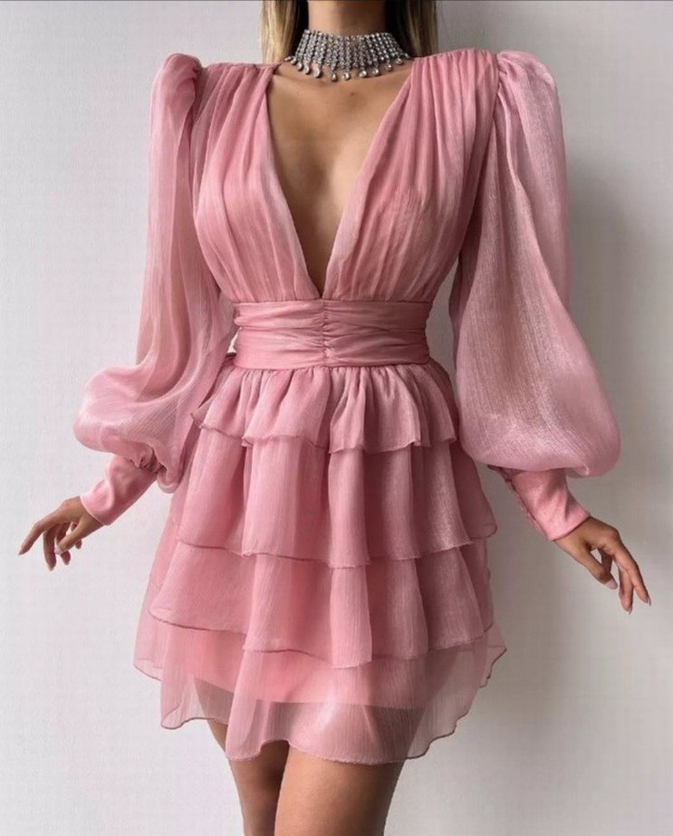 İpek gibi kumaştan yapılmış, derin V yakalı, kat kat fırfırlı pembe mini elbise. Uzun balon kollu, şık ve iddialı tasarım.