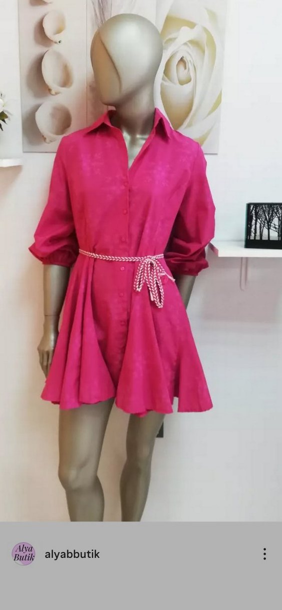 Parlak pembe mini elbise, bol kesim, yakalı Kemerli ve sentetik dokulu, bohem Paris tarzı. Günlük kullanıma uygun. Gömlek elbise