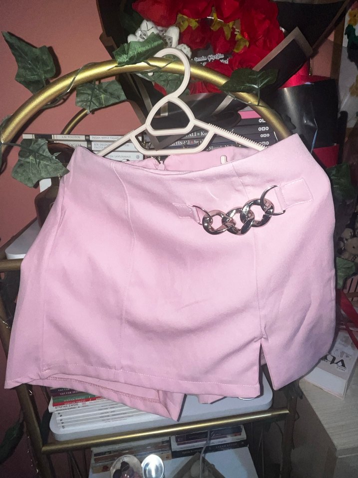 Pembe renkte, dar kesim mini etek şort etek. Sıfırdır, yalnızca etiketi yok. Bedeni olmadığı için satıyorum. Dar kesim. Herhangi bir deformesi yok.