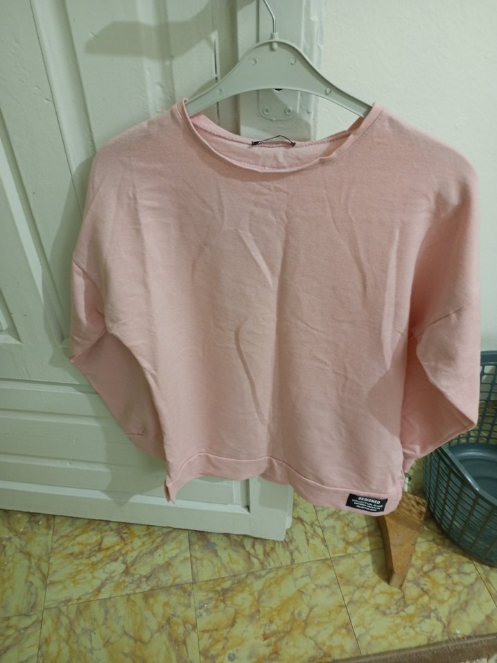 Pembe renk, yuvarlak yakalı, keten kumaştan, kısa kollu ve salaş kesim mini kadın sweatshirt. Günlük kullanıma uygun rahat ve şık bir parça.