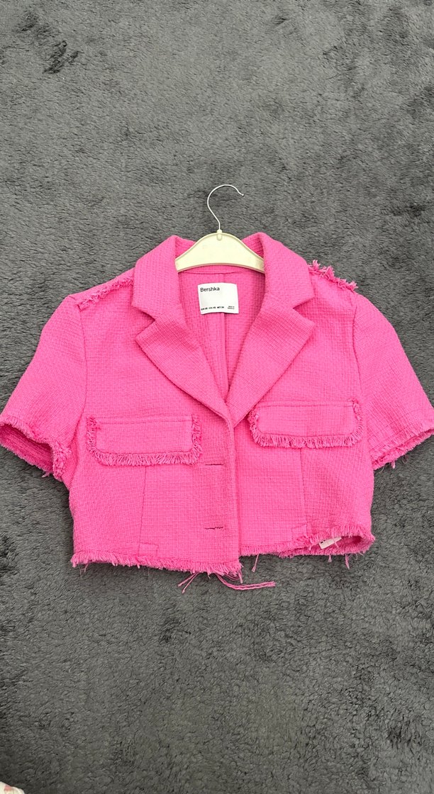 Pembe mini blazer, kısa kollu ve düğmeli. Sentetik kumaştan, regular fit ve Paris tarzı, günlük kullanım için uygun.
