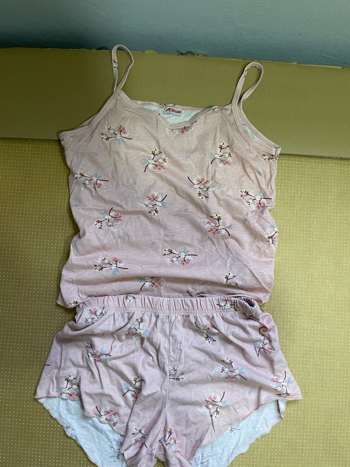 Pembe renkli, çiçek desenli, kısa kollu ve mini boy kadın pijama takımı. Rahat ve yumuşak kumaştan üretilmiştir.