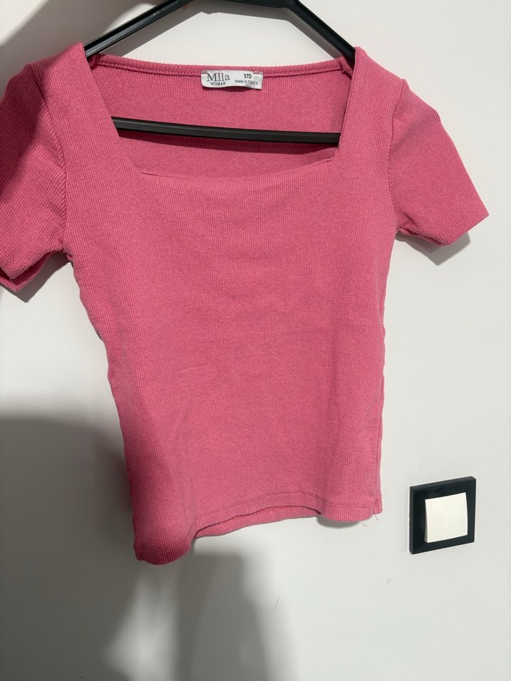 Pembe, kısa kollu ve kare yakalı, ince kesim mini tişört. Yumuşak sentetik kumaştan, rahat sokak stili için uygun.
