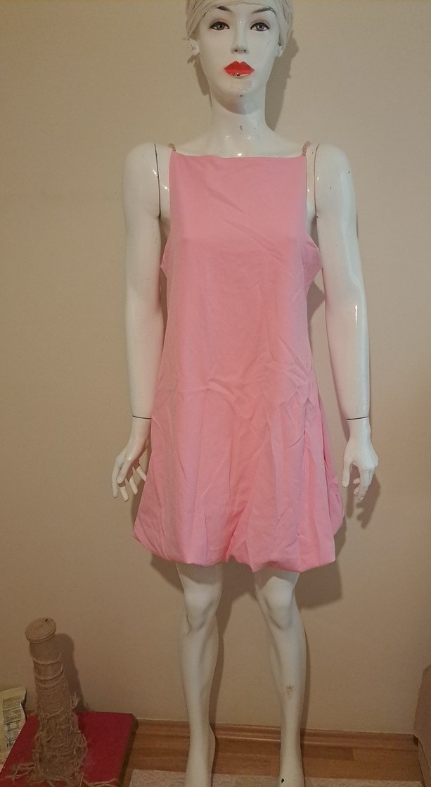 Pembe pastel renkte, kolsuz ve straplez yakalı, rahat kesim mini elbise. Yumuşak sentetik kumaştan günlük sokak stili için uygun.