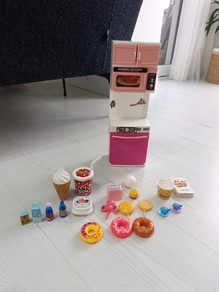 Pembe mini mutfak seti, dondurma, donut ve çeşitli küçük yiyecek-icecek aksesuarları ile birlikte.