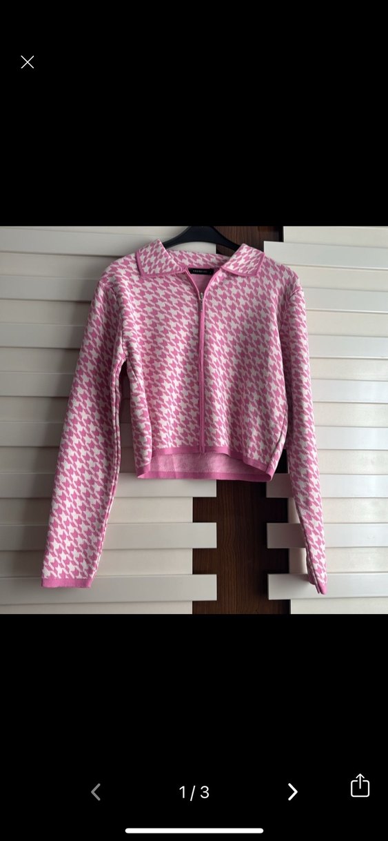 Pembe pastel renkte, kısa boylu, yakalı ve uzun kollu, rahat örgü kumaştan yapılmış, trend ve fitted kadın kazak. Sadece 1 kez giyildi