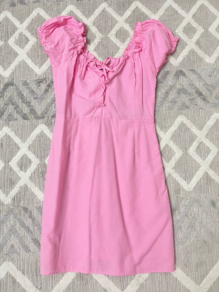 Pamuk kumaştan yapılmış, kısa kollu ve pastel pembe renkli, vücuda oturan mini elbise. Günlük kullanıma uygundur.