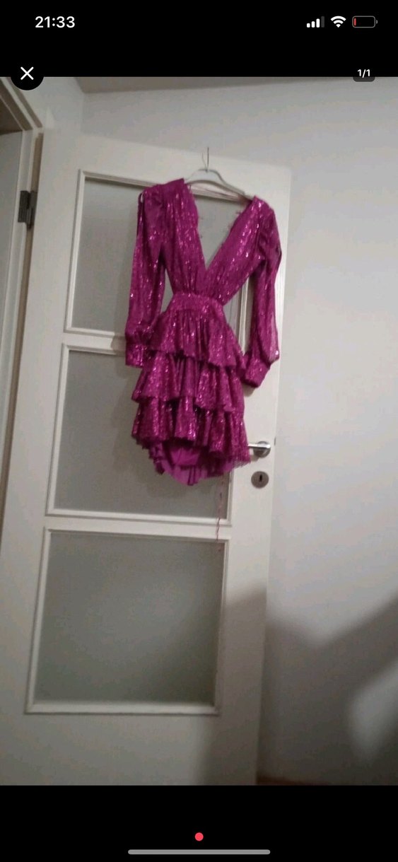 Pembe mini abiye elbise, V yaka ve kat kat fırfır detaylara sahiptir. Parlak kumaşı ve askılı kolları ile cesur, gösterişli bir parti şıklığı sunar. ✨