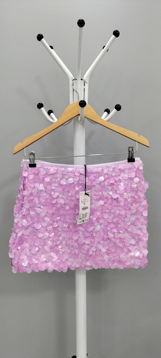Pembe tonlarında payetlerle süslenmiş, sentetik kumaştan, dar kesim mini etek. Parti ve sokak modasına uygun. ✨ m bedendir