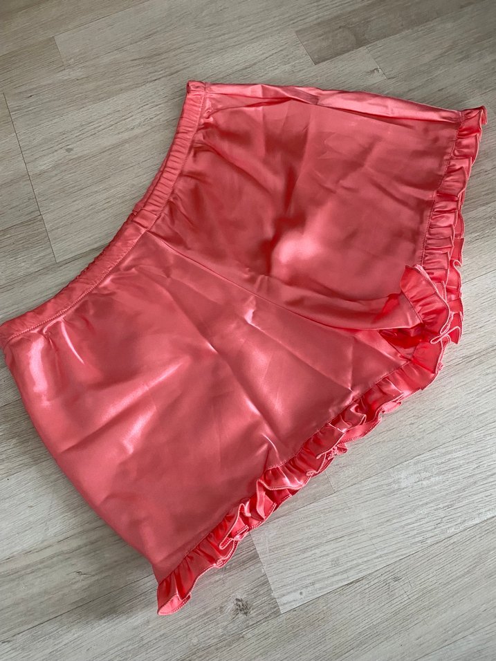 Parlak pembe, saten kumaştan yapılmış, kenarlarında fırfır detayları olan dar kesim kadın mini şort. Rahat ve şık bir sokak stili için ideal.